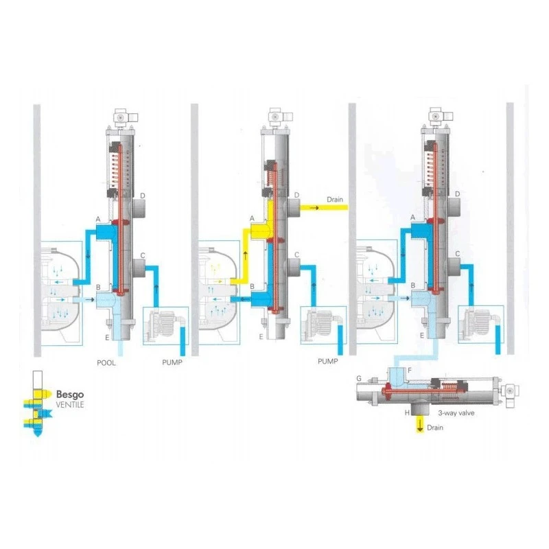 | Hoe werkt het? | InstallatieAlle aansluitingen op de automatische terugspoelklep kunnen buiten worden gelijmd (slip verbindingen) . De verbindingen naar de automatische terugspoelklep moeten worden gemaakt met behulp van schroefverbindingen of flenzen (breekbare koppelingen) en moeten vrij zijn van enige spanning bij installatie. Wijziging van de richting van aansluitingen C en DAls het leidingwerk niet evenwijdig is aan het apparaat , kunnen de verbindingen C en D 90 graden gedraaid worden. Bovendien is een fijnafstelling van +/- 4 ° mogelijk. Dit garandeert een perfecte installatie vrij van elke spanning . Voordeel:Het is mogelijk om de verbindingen van het toestel te allen tijde wijzigen. Naspoelen:In combinatie met een 3-weg klep kan een naspoelfunctie worden toegevoegd. |