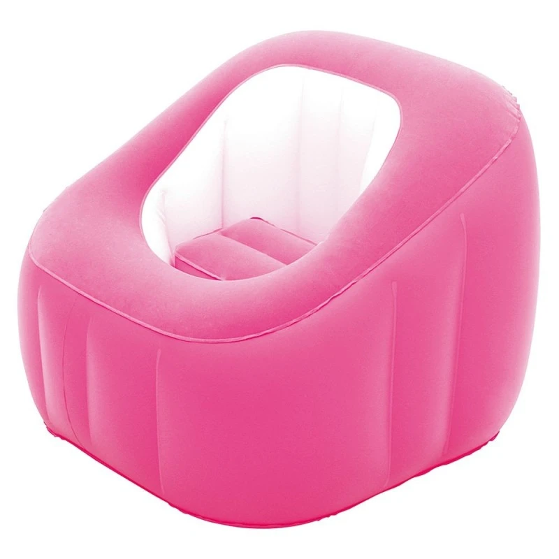 Opblaasbare kuipstoel met stevige I beam constructie en aangename flocked toplaag. Uitneembaar zitkussen. Met reparatie patch. In 3 kleuren assorti: oranje, roze en blauw. Afmeting: 74x74x64 cm.
