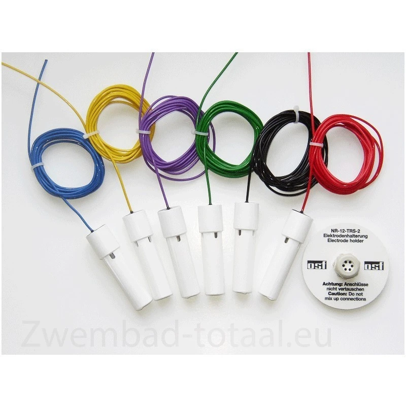 6 hangende elektroden met beschermhuls van kunststof en elektrodehouder.