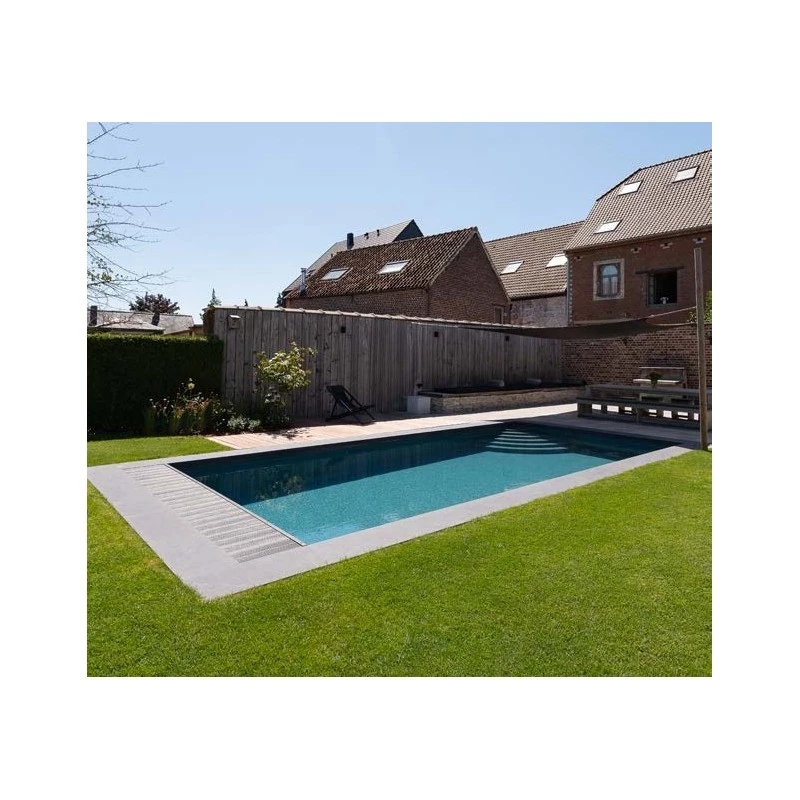 De zwembadwanden bestaan uit 6 opeenvolgende vinylester lagen versterkt composiet en één centrale laag met een isolerende honingraatstructuur. Deze gewapende opbouw geeft de nodige weerstand en maakt het geheel zelfdragend.