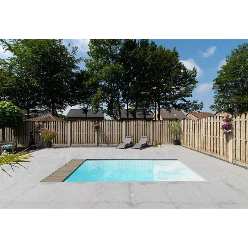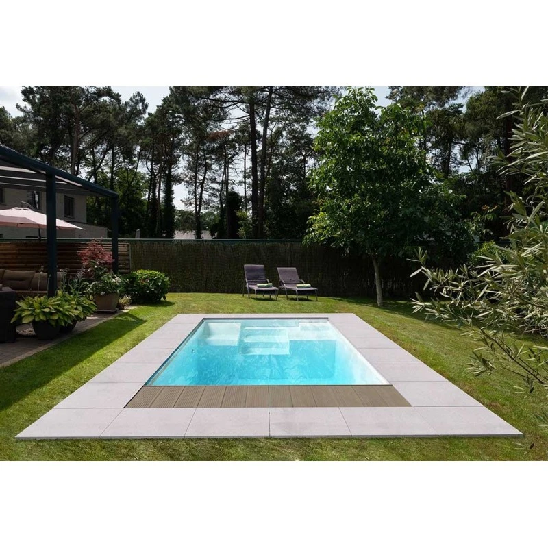 Vorm: rechthoekig zwembad voorzien van een onderwaterbank en een trap met 3 treden.