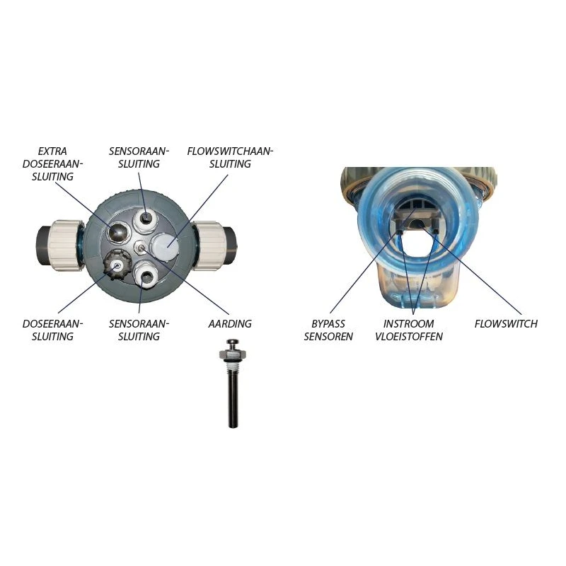 De ideale flowkamer! Met plaats voor flowswitch (flowswitch is optioneel), aarding, 2 sensor aansluitingen en 2 doseernippel aansluitingen. Voorzien van 50mm koppelingen, RVS aardpen met schroef, 2 sensor aansluitingen, 1 doseernippel aansluiting, en twee ½” pluggen. Intern bypass systeem zorgt voor perfecte waterdoorstroming voor de sensoren en voor het injecteren van vloeistoffen (zoals chloor en pH-).