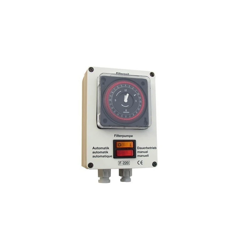 Compacte filterbesturing in een lichtgrijze kunststof behuizing. Analoge tijdschakelaar, aan / uit-schakelaar en handmatige / automatische schakelaar – zeer eenvoudig te gebruiken. Afmetingen behuizing: 165 x 100 x 80 mm. Voor 230 V filterpompen. Analoge schakelklok. Handmatige en automatische bediening. Aan / uit schakelaar.
